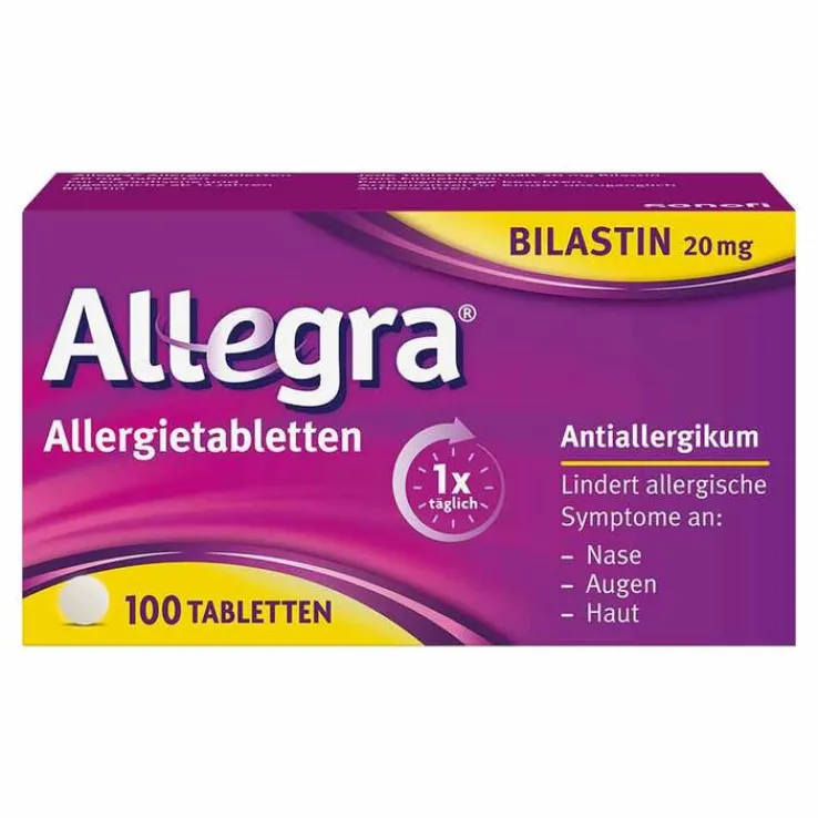 Allegra® Allergietabletten 20 mg Tabletten. Wirkstoff: Bilastin. Anwendungsgebiet: Antihistaminikum. Zur Linderung der Beschwerden allergischer Rhinokonjunktivitis und Urtikaria. Apothekenpflichtig. Zu Risiken und Nebenwirkungen lesen Sie die Packungsbeilage und fragen Sie Ihre Ärztin, Ihren Arzt oder in Ihrer Apotheke. A. Nattermann & Cie. GmbH, Brüningstraße 50, 65929 Frankfurt am Main. Stand: Dezember 2022 MAT-DE-2501021