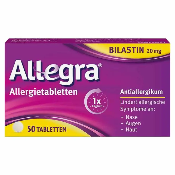 Allegra® Allergietabletten 20 mg Tabletten. Wirkstoff: Bilastin. Anwendungsgebiet: Antihistaminikum. Zur Linderung der Beschwerden allergischer Rhinokonjunktivitis und Urtikaria. Apothekenpflichtig. Zu Risiken und Nebenwirkungen lesen Sie die Packungsbeilage und fragen Sie Ihre Ärztin, Ihren Arzt oder in Ihrer Apotheke. A. Nattermann & Cie. GmbH, Brüningstraße 50, 65929 Frankfurt am Main. Stand: Dezember 2022 MAT-DE-2501021