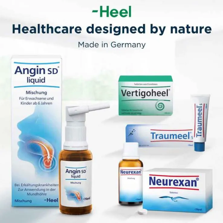 Angin SD® liquid. Mischung/Für Erwachsene und Kinder ab 6 Jahren Zul.-Nr.: 7007485.00.00 Anwendungsgebiet: Sie leiten sich von den homeopath. Arzneimittelbildern ab. Dazu gehören: Besserung von Halsschmerzen u. Schluckbeschwerden bei Hals-, Rachen- u. Mandelentzündungen. Warnhinweise: Enth. 39 mg Alkohol (Ethanol) pro Sprühstoß entsprechend 34,9 Vol.-%. Zu Risiken und Nebenwirkungen lesen Sie die Packungsbeilage und fragen Sie Ihre Ärztin, Ihren Arzt oder in Ihrer Apotheke. Biologische Heilmittel Heel GmbH Dr.-Reckeweg-Straße 2-4 76532 Baden-Baden, www.heel.de