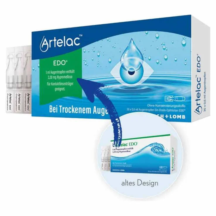Artelac® EDO® 3,20 mg/ml Augentropfen, Lösung. Wirkstoff: Hypromellose. Anwendungsgebiete: Zur symptomatischen Behandlung von Austrocknungserscheinungen der Horn- und Bindehäute (Trockenes Auge) durch Tränensekretions- und Tränenfunktionsstörungen infolge lokaler oder systemischer Erkrankungen sowie bei mangelndem oder unvollständigem Lidschluss, was sich z. B. in Augenbrennen, Fremdkörpergefühl und Lichtscheu bei Wind, Hitze und Ermüdung äußern kann. Zur Benetzung und Nachbenetzung weicher und harter Kontaktlinsen. Artelac® EDO® ist v. a. für Anwender geeignet, die konservierte, künstliche Tränenersatzmittel nicht vertragen. Warnhinweise: Arzneimittel für Kinder unzugänglich aufbewahren. Enthält Phosphate. Packungsbeilage beachten. Apothekenpflichtig. Zu Risiken und Nebenwirkungen lesen Sie die Packungsbeilage und fragen Sie Ihre Ärztin, Ihren Arzt oder in Ihrer Apotheke. Dr. Gerhard Mann chem.-pharm. Fabrik GmbH, Brunsbütteler Damm 165/173, 13581 Berlin (Stand: August 2020)