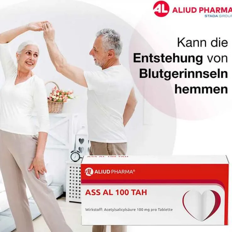 ASS AL 100 TAH Wirkstoff: Acetylsalicylsäure. Instabile Angina pectoris (Herzschmerzen aufgrund von Durchblutungsstörungen in den Herzkranzgefäßen) – als Teil der Standardtherapie. Akuter Herzinfarkt – als Teil der Standardtherapie. Vorbeugung eines weiteren Herzinfarktes nach erstem Herzinfarkt (Reinfarktprophylaxe). Nach Operationen oder anderen Eingriffen an arteriellen Blutgefäßen (nach arteriellen gefäßchirurgischen oder interventionellen Eingriffen, z.B. nach aortokoronarem Venen-Bypass ACVB, bei perkutaner transluminaler koronarer Angioplastie PTCA). Vorbeugung von vorübergehender Mangeldurchblutung im Gehirn (TIA: transitorischen ischämischen Attacken) und Hirninfarkten, nachdem Vorläuferstadien (z. B. vorübergehende Lähmungserscheinungen im Gesicht oder der Armmuskulatur oder vorübergehender Sehverlust) aufgetreten sind. Hinweis: Eignet sich nicht zur Behandlung von Schmerzzuständen und als fiebersenkendes Mittel. Zu Risiken und Nebenwirkungen lesen Sie die Packungsbeilage und fragen Sie Ihren Arzt oder Apotheker. ALIUD PHARMA® GmbH, Postfach 1380, 89146 Laichingen Stand: August 2019