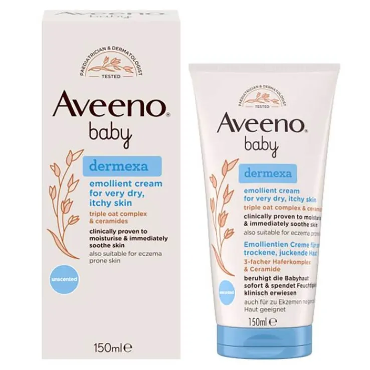 Aveeno baby Dermexa Emollientien Creme mit 3-fachem Haferkomplex, Ceramiden & Panthenol, beruhigt sehr trockene, juckende Babyhaut & spendet intensive Feuchtigkeit – klinisch erwiesen. Sie ist für Neugeborene und Kinder mit sehr trockener, juckender und zu Neurodermitis neigender Haut geeignet.