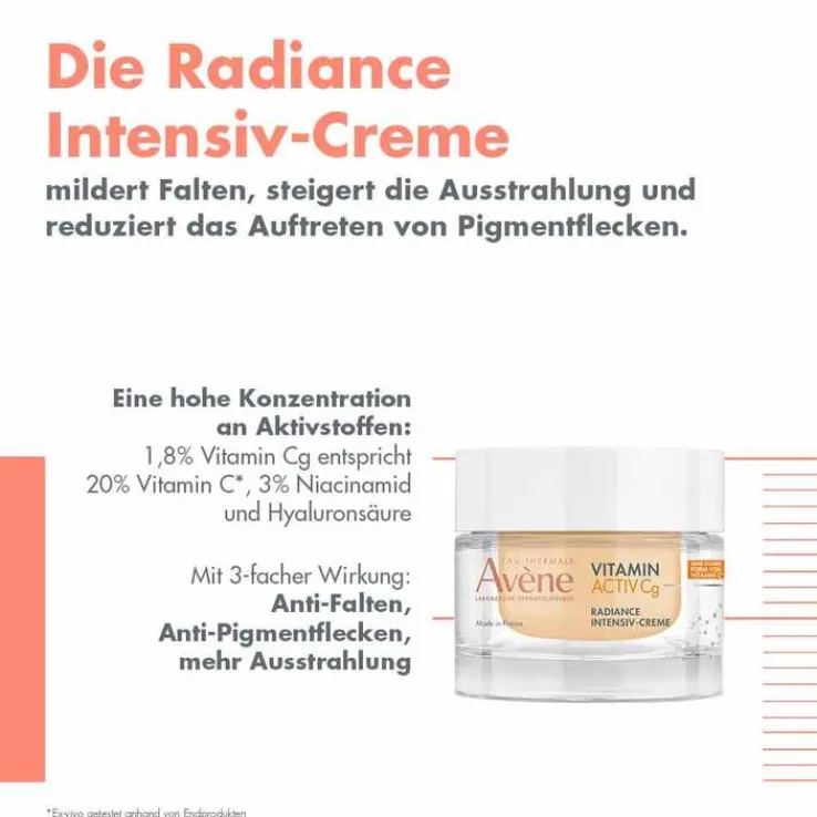Die Avene Dermatological Laboratories haben die Vitamin Activ Cg Radiance Intensiv-Creme entwickelt, die 3 dermatologische Aktivstoffe enthält: