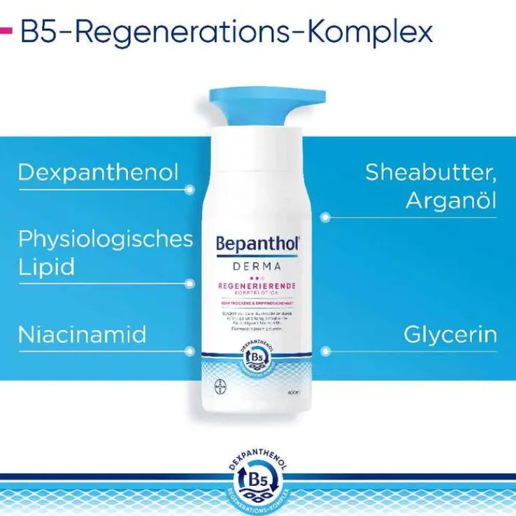 Die Wirksamkeit und Verträglichkeit der Bepanthol Derma regenerierende Körperlotion ist klinisch geprüft. Die Lotion ist auch zur Pflege bei Diabetes geeignet. 90 % der Inhaltsstoffe sind natürlichen Ursprungs.
