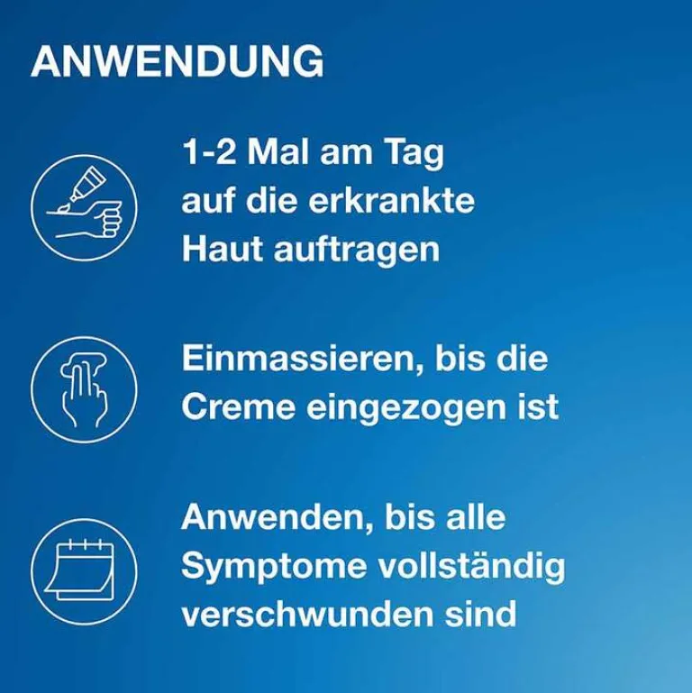 Wenn nicht anders verordnet, 1 – 2-mal am Tag auf die erkrankte Haut und die umgebende Hautfläche (ca. 1 – 2 cm) auftragen und mit dem Finger so lange einmassieren, bis die Creme eingezogen ist.