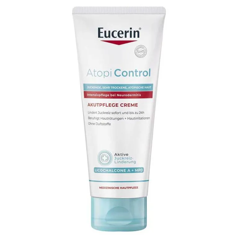 Die Eucerin AtopiControl Akutpflege Creme wurde speziell für zur Neurodermitis Behandlung entwickelt. Sie lindert bei akuten Schubphasen wirksam den Juckreiz, Hautentzündung sowie Spannungsgefühl und beruhigt die Haut. Die Creme kann so oft wie nötig zur Hautpflege auf die betroffenen Hautstellen aufgetragen werden, um Linderung zu verschaffen.