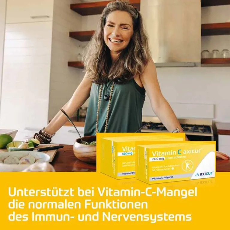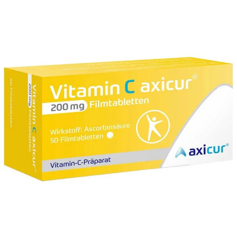 Vitamin C axicur® 200 mg Filmtabletten Wirkstoff: Ascorbinsäure. Anwendungsgebiete: Vitamin-C-Präparat zur Behandlung von Vitamin-C-Mangel-Krankheiten. Zur Vorbeugung eines Vitamin-C-Mangels, wenn die ausreichende Zufuhr durch Ernährung nicht gesichert ist. Enthält Lactose. Zu Risiken und Nebenwirkungen lesen Sie die Packungsbeilage und fragen Sie Ihre Ärztin, Ihren Arzt oder in Ihrer Apotheke. axicorp Pharma GmbH, 61381 Friedrichsdorf. Stand: April 2022