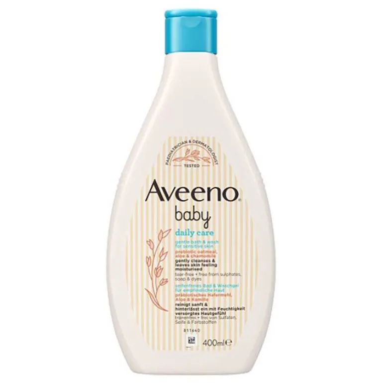 Aveeno baby daily care seifenfreies Bad & Waschgel mit beruhigendem präbiotischem Hafermehl, Aloe & Kamille nährt, beruhigt & schützt empfindliche Babyhaut ab Tag 1. Es reinigt sanft, hinterlässt ein mit Feuchtigkeit versorgtes Hautgefühl und ist für Neugeborene und Kindern mit normaler bis trockener, empfindlicher Haut geeignet.