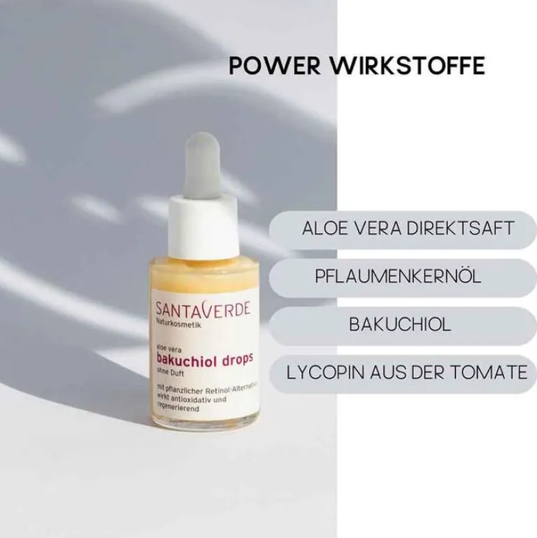 Reiner Aloe Vera Saft ist feuchtigkeitsspendend. Bakuchiol, die pflanzliche und milde Retinol Alternative, wirkt Sonnenschäden entgegen, aktiviert die Zellerneuerung und hat antioxidative, festigende und antientzündliche Effekte. Das Antioxidans Lycopin aus Tomaten wirkt effektiv gegen freie Radikale. Nährendes Pflaumenkernöl schützt die Haut vor Feuchtigkeitsverlust. Verleiht ein geglättetes, verfeinertes und ebenmäßiges Hautbild. Das Serum ist besonders geeignet für sensible, irritierte und anspruchsvolle Haut.