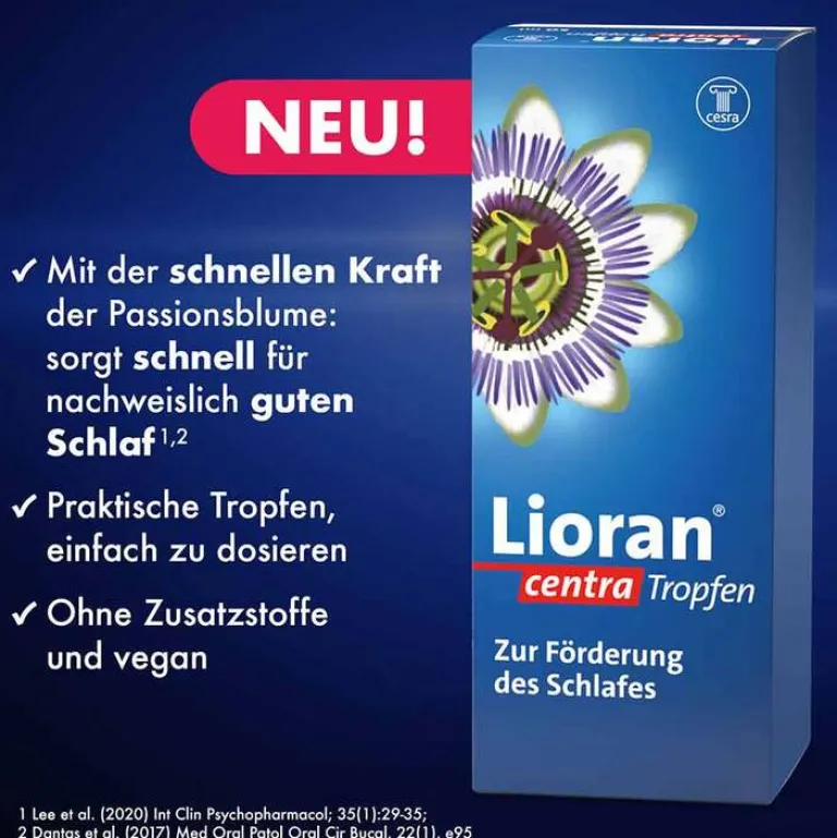 Lioran® centra Tropfen. Wirkstoff: Passionsblumenkraut-Fluidextrakt. Traditionelles pflanzliches Arzneimittel für Erwachsene zur Besserung des Befindens bei nervlicher Belastung und zur Förderung des Schlafes ausschließlich auf Grund langjähriger Anwendung. Enthält 1,2 g Alkohol (Ethanol) pro 2 ml. (Stand: 03/2024) Zu Risiken und Nebenwirkungen lesen Sie die Packungsbeilage und fragen Sie Ihre Ärztin, Ihren Arzt oder in Ihrer Apotheke. Cesra Arzneimittel GmbH & Co. KG, Braunmattstraße 20, 76532 Baden-Baden