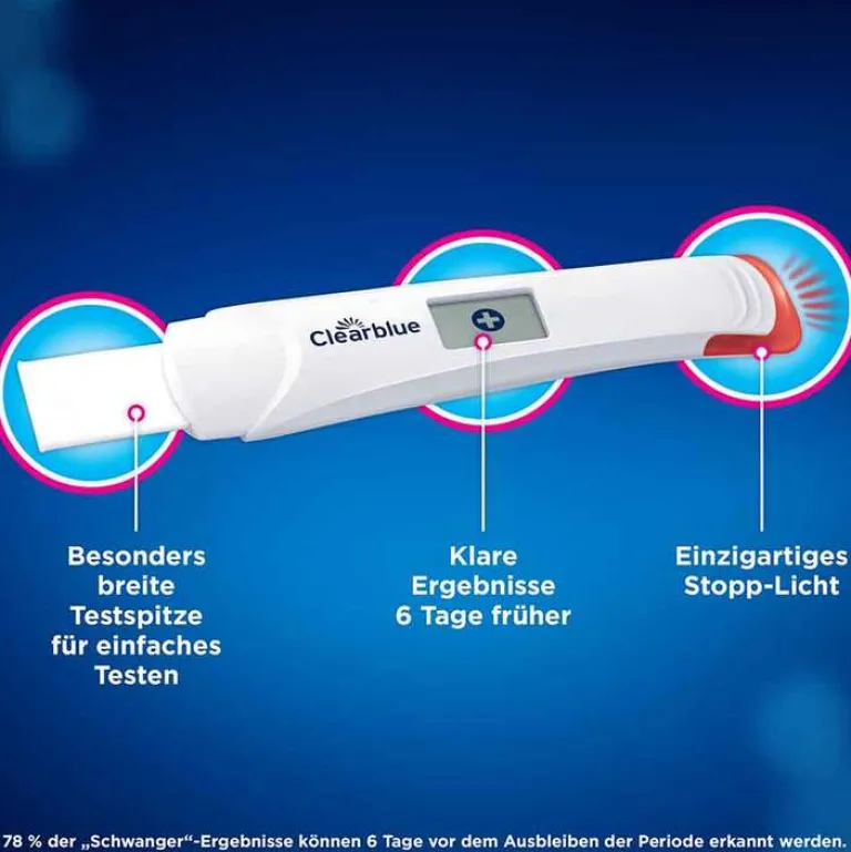 * Der Clearblue Schwangerschaftstest Ultra Frühtest Digital liefert Ergebnisse 6 Tage vor Ausbleiben der Periode (78 % der „Schwanger“- Ergebnisse können 6 Tage vor dem Ausbleiben der Periode erkannt werden (dies entspricht 5 Tage vor Fälligkeit der Periode). Der Clearblue Schwangerschaftstest Ultra Früh liefert Ergebnisse 6 Tage vor Ausbleiben der Periode ( 79 % der „Schwanger“-Ergebnisse können 6 Tage vor dem Ausbleiben der Periode erkannt werden (dies entspricht 5 Tage vor Fälligkeit der Periode).