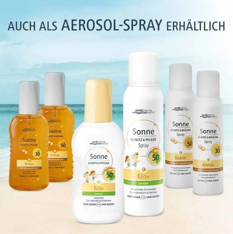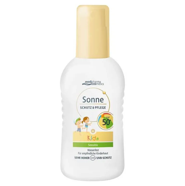 Das wasserfeste Sonnenspray Schutz & Pflege Kids mit LSF 50+ von Medipharma Cosmetics für empfindliche Kinderhaut ist eine leichte Emulsion mit sehr hohem und zuverlässigem Sonnenschutz.
