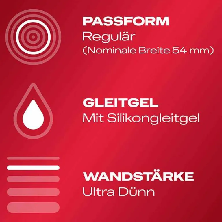Die durex® Gefühlsecht Ultra Kondome sind an der Spitze noch dünner – für noch mehr Gefühl im Vergleich zu unseren Gefühlsecht Classic Kondomen. Sie haben eine nominale Breite von 54 mm (reguläre Passform) und sind mit Silikongleitgel befeuchtet – so wird der Sex für euch noch angenehmer. Die glatte, gerade Form mit Reservoir sorgt für einen komfortablen Sitz. Dank der neuen Formel mit speziellen Inhaltsstoffen riechen die Kondome außerdem angenehm.