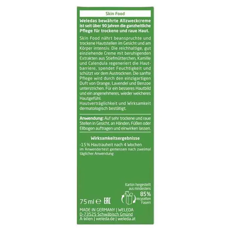 Weleda Skin Food ist eine natürliche Basispflege für die ganze Familie – besonders bei trockener, rauer und spröder Haut. Die Komposition mit Auszügen aus Stiefmütterchen, Kamillen- und Calendulablüten sind hautberuhigend. Schon seit 90 Jahren vertrauen Weleda Kunden diesem Klassiker – für glatte und zarte Haut.
