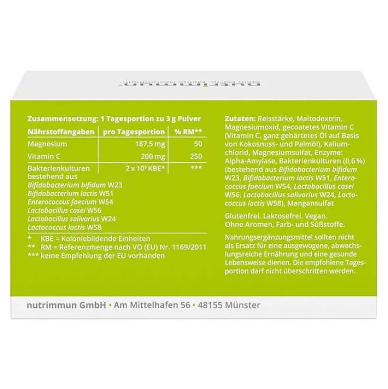 Reisstärke, Maltodextrin, Magnesiumoxid, gecoatetes Vitamin C (Vitamin C, ganz gehärtetes Öl auf Basis von Kokosnuss- und Palmöl), Kaliumchlorid, Magnesiumsulfat, Enzyme: Alpha-Amylase, Bakterienkulturen (0,6 %) (bestehend aus Bifidobacterium bifidum W23, Bifidobacterium lactis W51, Enterococcus faecium W54, Lactobacillus casei W56, Lactobacillus salivarius W24, Lactococcus lactis W58), Mangansulfat