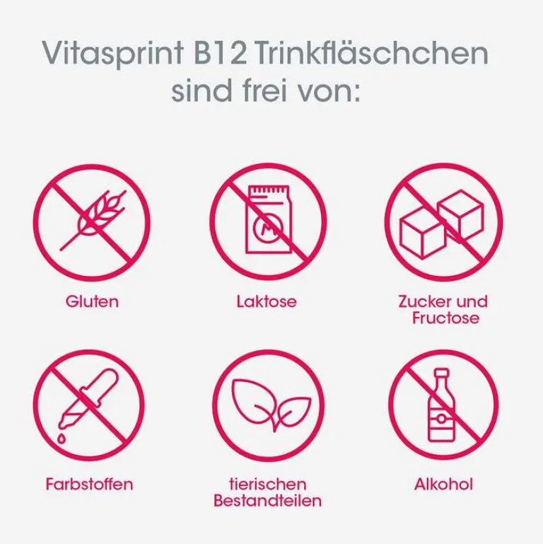 vitasprint B12 Trinkfläschchen dürfen nicht eingenommen werden, wenn Sie allergisch gegen DL-Phosphonoserin, Glutamin, Cyanocobalamin (Vitamin B12) oder gegen den Konservierungsstoff Natriummethyl-4-hydroxybenzoat oder einen der sonstigen Bestandteile dieses Arzneimittels sind.