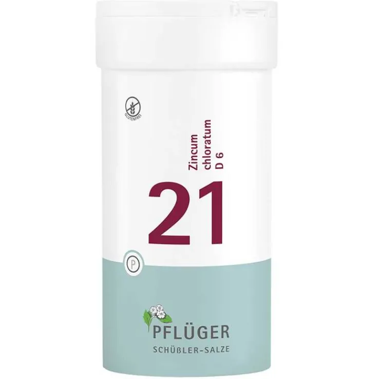 Biochemie Pflüger® Nr. 21 Zincum chloratum D6, Zusammensetzung: 1 Tablette enthält: Wirkstoff: Zincum chloratum Trit. D6 250 mg. Sonstige Bestandteile: Calciumbehenat (DAB), Kartoffelstärke. Registriertes homöopathisches Arzneimittel, daher ohne Angabe einer therapeutischen Indikation. Gegenanzeigen/Nebenwirkungen: keine bekannt. Enthält Lactose. Packungsbeilage beachten. Zu Risiken und Nebenwirkungen lesen Sie die Packungsbeilage und fragen Sie Ihre Ärztin, Ihren Arzt oder in Ihrer Apotheke. Homöopathisches Laboratorium Alexander Pflüger GmbH & Co. KG · 33378 Rheda-Wiedenbrück · [email protected] · www.pflueger.de