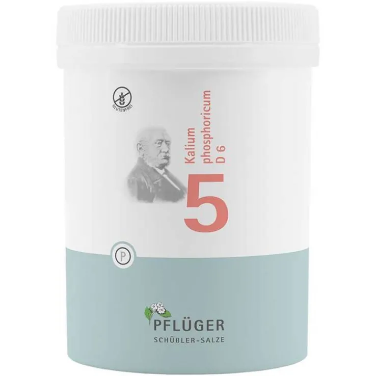 Biochemie Pflüger® Nr. 5 Kalium phosphoricum D 6 , Zusammensetzung: 1 Tablette enthält: Wirkstoff: Kalium phosphoricum D 6 250 mg. Sonstige Bestandteile: Calciumbehenat (DAB), Kartoffelstärke. Registriertes homöopathisches Arzneimittel, daher ohne Angabe einer therapeutischen Indikation. Gegenanzeigen/Nebenwirkungen: keine bekannt. Enthält Lactose. Packungsbeilage beachten. Zu Risiken und Nebenwirkungen lesen Sie die Packungsbeilage und fragen Sie Ihre Ärztin, Ihren Arzt oder in Ihrer Apotheke. Homöopathisches Laboratorium Alexander Pflüger GmbH & Co. KG, 33378 Rheda-Wiedenbrück | [email protected] | www.pflueger.de
