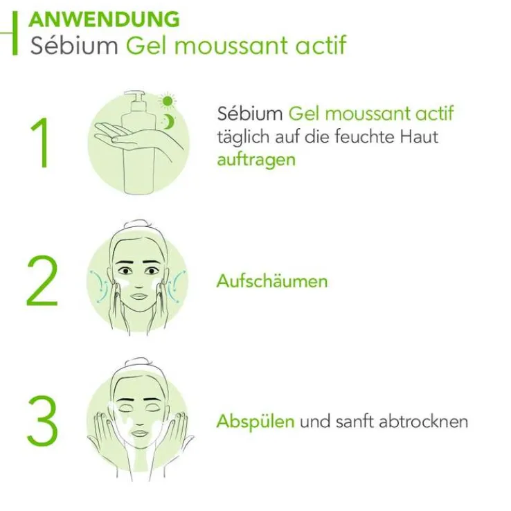 Sebium Gel moussant actif täglich morgens und abends auf die angefeuchtete Haut auftragen. Nach dem Aufschäumen gründlich abspülen und das Gesicht mit einem sauberen Handtuch sanft abtrocknen.
