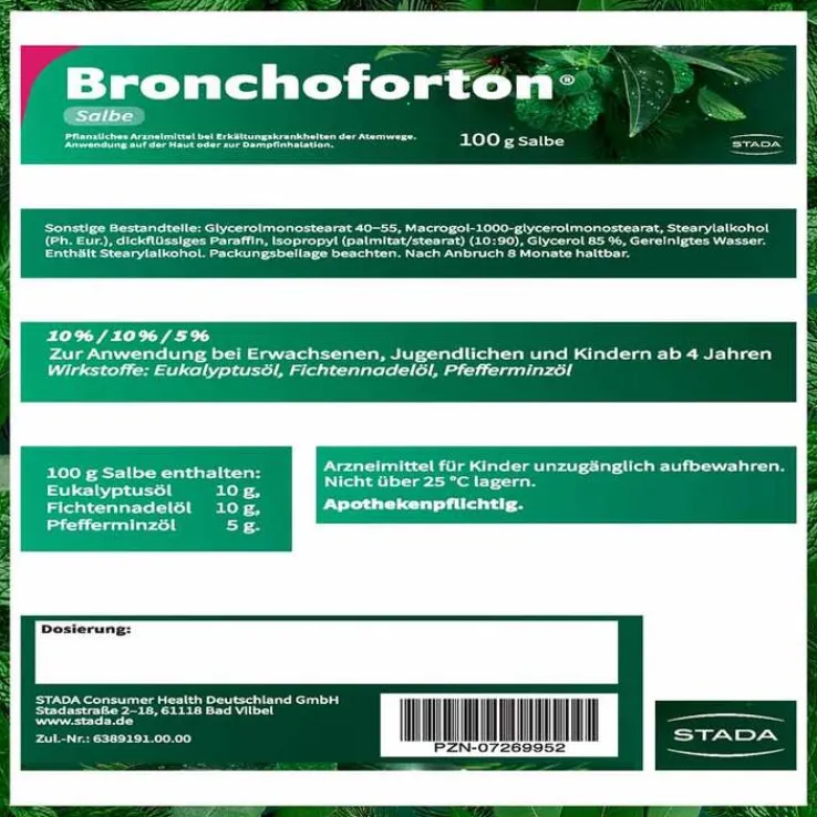 Bronchoforton® Salbe10%/10%/5% Zur Anwendung bei Kindern ab 4 Jahren und Erwachsenen Wirkstoffe: Eukalyptusöl, Fichtennadelöl, Pfefferminzöl. Zur Inhalation und äußerlichen Anwendung zur Besserung der Beschwerden bei Erkältungskrankheiten der Atemwege mit zähflüssigem Schleim. Hinweis: Enthält Stearylalkohol. Zu Risiken und Nebenwirkungen lesen Sie die Packungsbeilage und fragen Sie Ihre Ärztin, Ihren Arzt oder in Ihrer Apotheke. STADA Consumer Health Deutschland GmbH, Stadastraße 2-18, 61118 Bad Vilbel Stand: März 2022