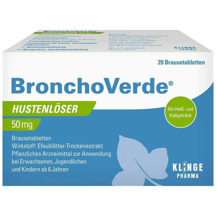 BronchoVerde® Hustenlöser 50 mg Brausetabletten: Wirkstoff: Trockenextrakt aus Efeublättern. Anwendungsgebiet: Pflanzliches Arzneimittel zur Schleimlösung bei Husten mit Auswurf bei Erwachsenen, Jugendlichen und Kindern ab 6 Jahren. Warnhinweise: Enthält Natriumverbindungen u. Sorbitol. Arzneimittel f. Kinder unzugängl. aufbewahren. Stand: 10/21-2. Zu Risiken und Nebenwirkungen lesen Sie die Packungsbeilage und fragen Sie Ihre Ärztin, Ihren Arzt oder in Ihrer Apotheke. Klinge Pharma GmbH, 83607 Holzkirchen, Deutschland