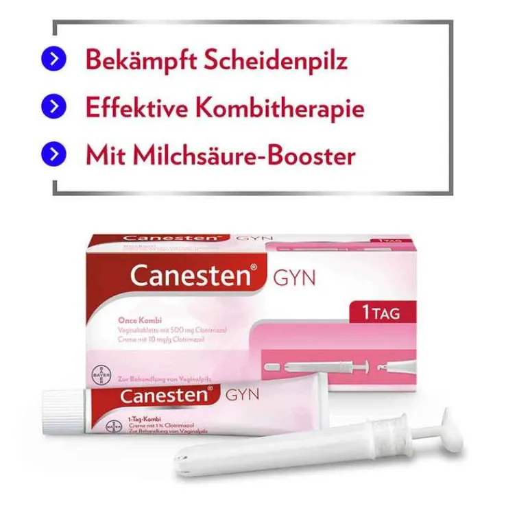 Canesten® GYN Once Kombi Wirkstoff: Clotrimazol Anwendungsgebiete Kombipackungen: Bei infektiösem Ausfluss, verursacht durch Hefepilze; Entzündungen der Scheide und Schamlippen durch Pilze – meist Hefepilze der Gattung Candida – sowie überlagernde Infektionen (Superinfektionen) mit Clotrimazol-empfindlichen Bakterien. Hinweis für Creme: Enthält Benzylalkohol und Cetylstearylalkohol. Packungsbeilage beachten! Zu Risiken und Nebenwirkungen lesen Sie die Packungsbeilage und fragen Sie Ihre Ärztin, Ihren Arzt oder in Ihrer Apotheke. Bayer Vital GmbH, 51368 Leverkusen, Deutschland. Stand: 09/2020