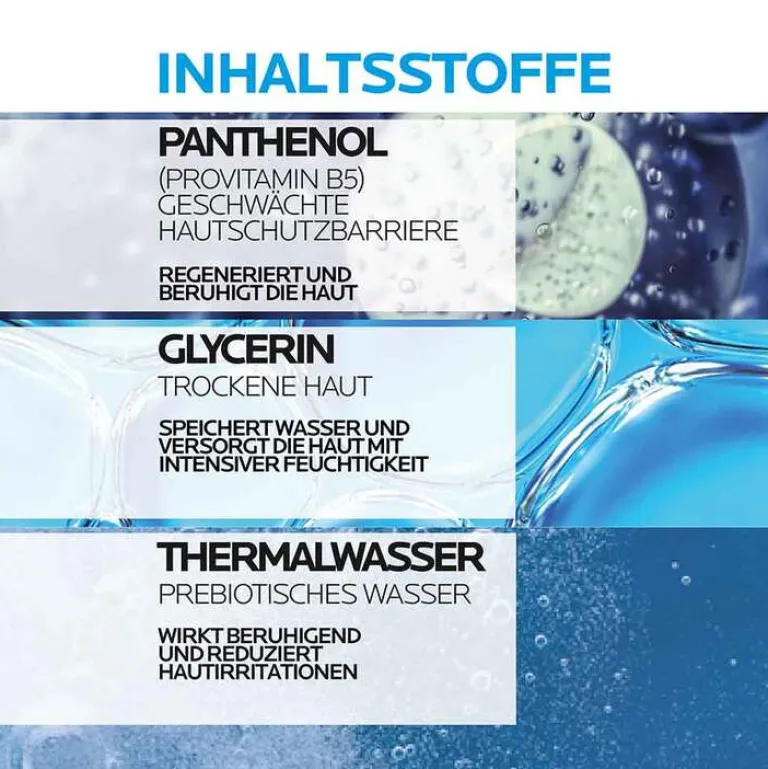 - 5 % Panthenol beruhigt bei Hautirritationen und mildert Juckreiz und Spannungsgefühle.