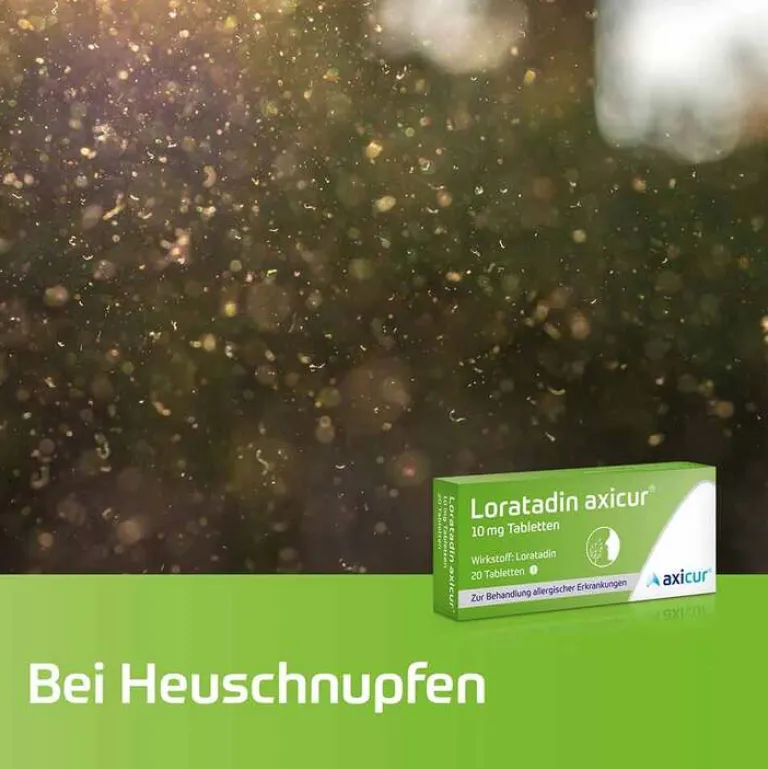 Loratadin axicur® 10 mg Tabletten. Anwendungsgebiete: Zur Linderung der Symptome bei allergischer Rhinitis (z. B. Heuschnupfen) wie Niesen, laufende oder juckende Nase und brennende oder juckende Augen bei Erwachsenen und Kindern über 2 Jahren mit einem Körpergewicht von mehr als 30 kg. Zur Linderung von Symptomen bei Urtikaria (Nesselsucht) wie Juckreiz, Hautrötung sowie Anzahl und Größe der Quaddeln. Enthält Lactose. Packungsbeilage beachten. Zu Risiken und Nebenwirkungen lesen Sie die Packungsbeilage und fragen Sie Ihren Arzt oder Apotheker. axicorp Pharma GmbH, 61381 Friedrichsdorf. Stand: April 2022