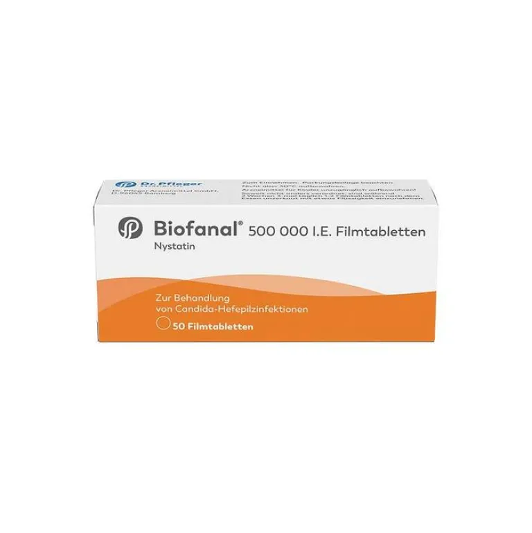 Biofanal® Filmtabletten. Wirkstoff: Nystatin. Anw.: Zur topischen intestinalen Behandl. nachgewiesener Nystatin-empf. Hefepilzinfekt., insbes. als Folge einer Therapie mit Antibiotika, Zytostatika od. Kortikoiden. Enth. Lactose. Gebrauchsinfo. beachten. Zu Risiken und Nebenwirkungen lesen Sie die Packungsbeilage und fragen Sie Ihre Ärztin, Ihren Arzt oder in Ihrer Apotheke. (BF/04062020/LW/G)