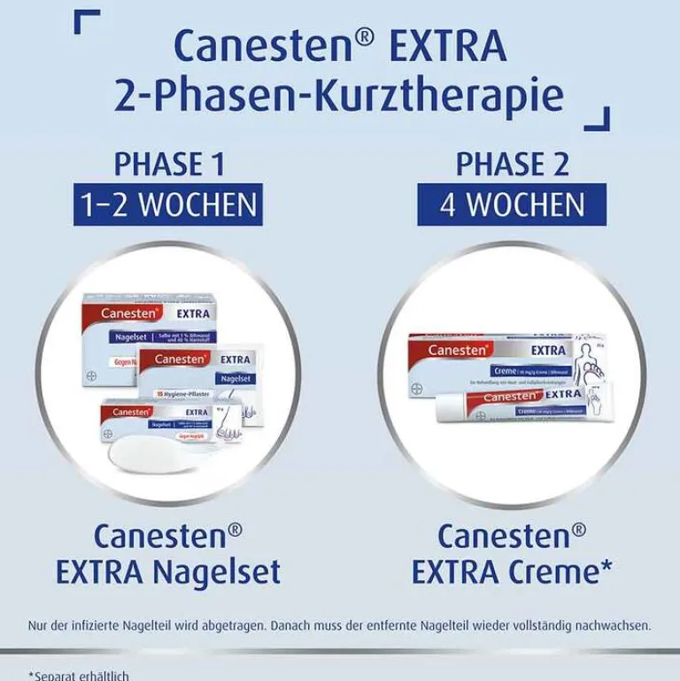 - Die 2-Phasen-Kurztherapie mit der Kombination aus dem Canesten® EXTRA Nagelset und der Canesten® EXTRA Creme bekämpft Nagelpilz schnell, gründlich und effektiv.