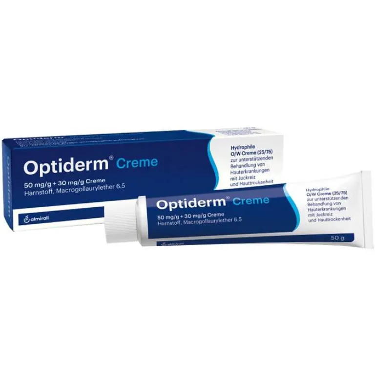 Optiderm® Creme. Anwendungsgebiete: Zur Feuchtigkeitsregulierung der Hornschicht, Fettung und Juckreizstillung, als unterstützende Behandlung bei Hauterkrankungen mit trockener und/oder juckender Haut, wie z.B. atopisches Ekzem (Neurodermitis), Exsikkationsekzem (Austrocknungsschäden durch Waschmittel etc.), sowie zur Weiter- und Nachbehandlung der genannten Hauterkrankungen. Warnhinweise: Benzylalkohol kann leichte lokale Reizungen hervorrufen. Stand der Information: Juli 2021. Zu Risiken und Nebenwirkungen lesen Sie die Packungsbeilage und fragen Sie Ihre Ärztin, Ihren Arzt oder in Ihrer Apotheke. Almirall Hermal GmbH • D-21462 Reinbek. www.almirall.de – e-mail:[email protected]