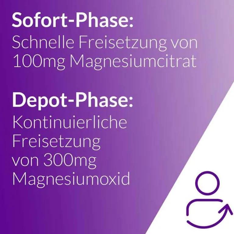 Magnetrans Depot 400mg unterstützt den Körper mit einer modernen 2-Phasen-Technologie mit insgesamt 400mg Magnesium. Der spezielle Aufbau der Tablette sorgt dafür, dass ein Teil des enthaltenen Magnesiums sofort nach der Einnahme innerhalb der ersten ca. 45 Minuten freigesetzt wird, während die verzögert einsetzende Depot-Phase ihn anschließend über mehrere Stunden hinweg mit Magnesium versorgt.