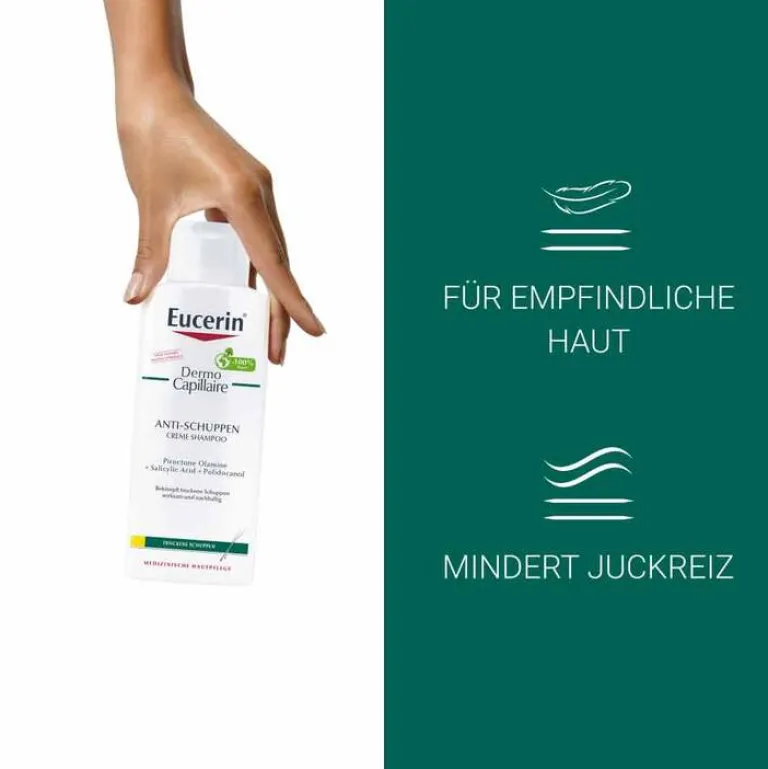 Zu Schuppen neigende Kopfhaut hat besondere Bedürfnisse und sollte speziell gepflegt werden. Um dieser Pflege gerecht zu werden, hat Eucerin das DermoCapillaire Anti-Schuppen Creme Shampoo entwickelt, das sich speziell für die Anwendung bei trockenen Schuppen eignet.