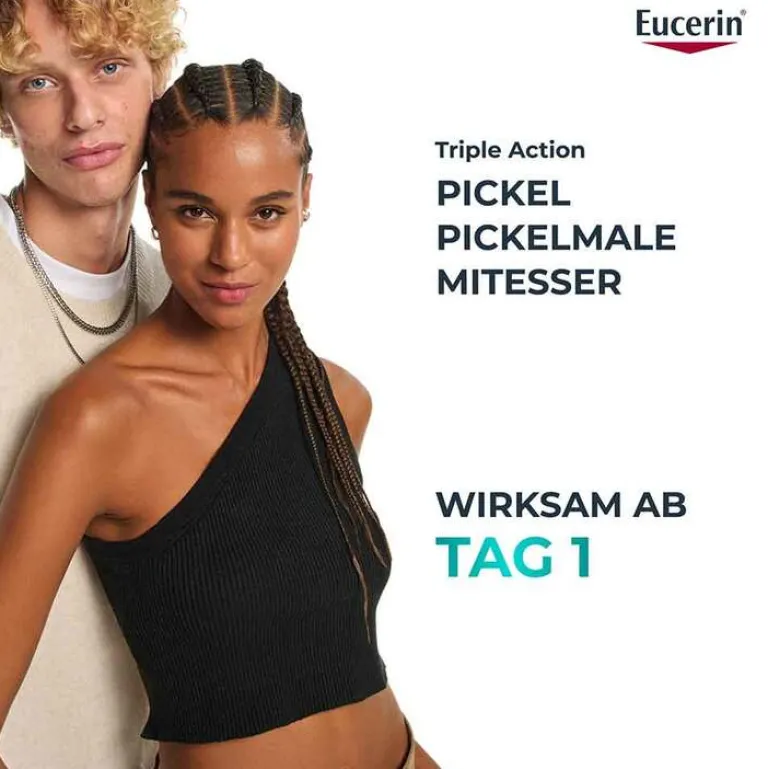 Die Eucerin® DERMOPURE CLINICAL Triple Action 3-fach tiefenwirksame Pflege 40 ml korrigiert die wichtigsten Anzeichen fettiger, zu Akne neigender Haut: Pickel, Mitesser und Pickelmale. Die einzigartige und konzentrierte Formel der Gesichtscreme kombiniert 2% Salicylsäure mit patentiertem Thiamidol® für ein klareres, strahlenderes Hautbild.