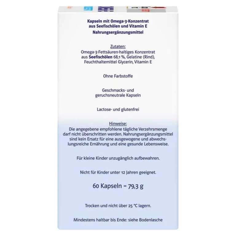 Die Kapseln von Doppelherz system enthalten ein hochgereinigtes Konzentrat (60 %) aus Seefischölen. In einer Kapsel sind enthalten: