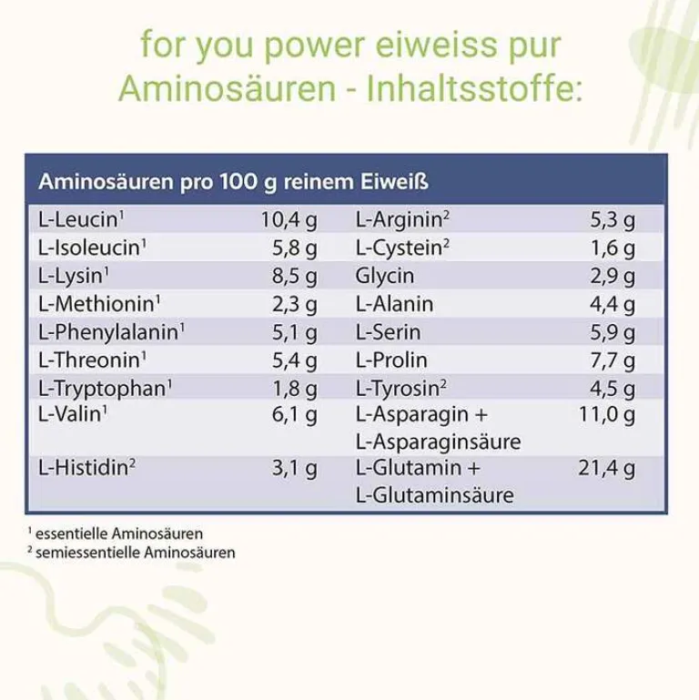 Das Eiweißpulver ist eine Mischung aus vier biologisch sehr hochwertigen Proteinquellen. Es ist gut löslich & fettarm. Durch die Kombination verschiedener Eiweißquellen hat es eine ausgewogene Bilanzierung aller Aminosäuren. For You Eiweiß Power setzt sich aus vier hochwertigen Eiweißkomponenten zusammen.