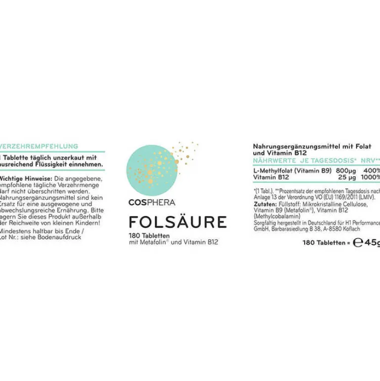 Jede Tablette der Cosphera Folsäure Tabletten enthält 800 μg (mcg) natürliches Folat. 180 Tabletten genügen um den Körper ein halbes Jahr lang mit hoch dosierten Inhaltsstoffen zu versorgen. Im Präparat ist eine Kombination aus bioaktiver Folsäure und Vitamin B12 enthalten.