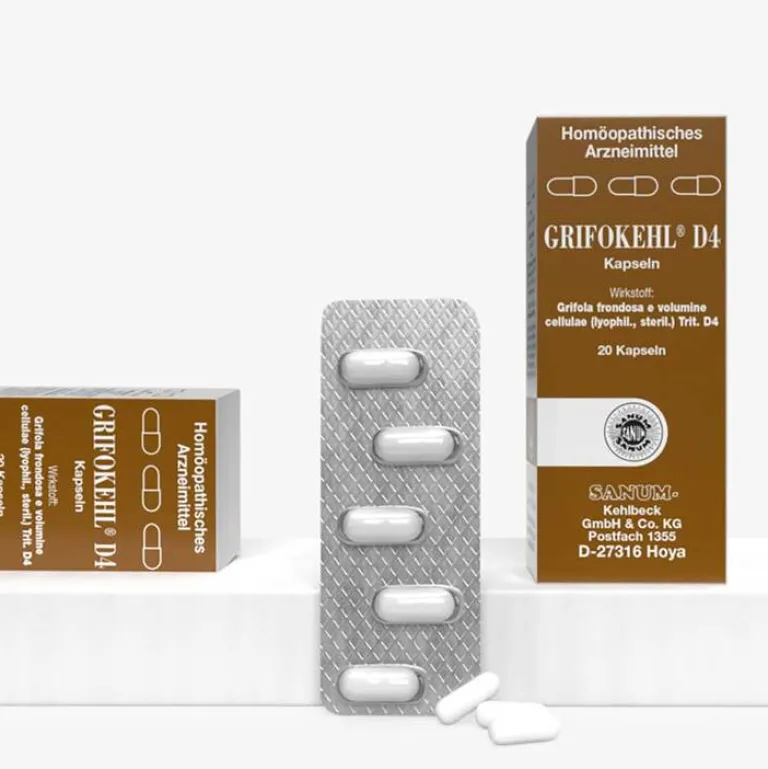 GRIFOKEHL ® D4 – Kapseln. Zusammensetzung: 1 Kapsel enthält: Wirkstoff: 330 mg Grifola frondosa e volumine cellulae (lyophil., steril.) Trit. D4 (HAB, Vorschrift 6 mit Lactose) Sonstiger Bestandteil: Kapselhülle: Hypromellose Erfahrungsgemäß unterstützend angewendet bei: Homöopathisches Arzneimittel, daher ohne Angabe einer therapeutischen Indikation. Präparat nach der 1000er-Regel. Gegenanzeigen: Bei bekannter Überempfindlichkeit gegenüber Klapperschwämmen (Grifola frondosa) sollte das Präparat nicht angewendet werden. Nebenwirkungen: Aufgrund des Gehaltes an spezifischen, organischen Bestandteilen in GRIFOKEHL® D4 können in seltenen Fällen Überempfindlichkeitsreaktionen auftreten. Hinweis: Bei der Anwendung eines homöopathischen Arzneimittels können sich die vorhandenen Beschwerden vorübergehend verschlimmern (Erstverschlimmerung). In diesem Fall sollten Sie das Arzneimittel absetzen und Ihren Arzt/Heilpraktiker befragen. Hersteller: SANUM-Kehlbeck GmbH & Co. KG, Postfach 1355, 27316 Hoya.