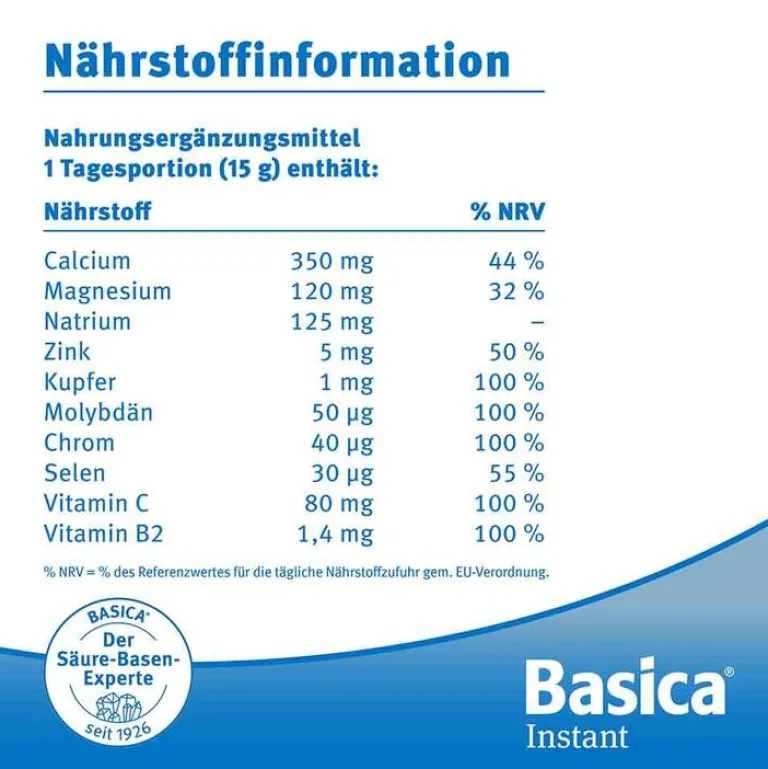 Inhaltsstoffe pro Tagesdosis (für 2 Messlöffel, entsprechen 15 g) Basica Instant