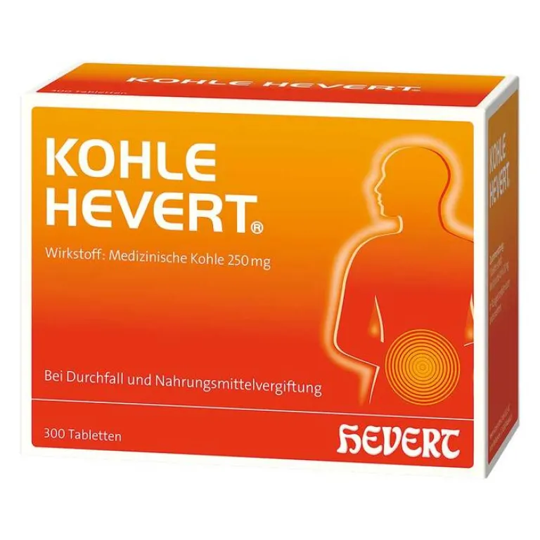 Kohle Hevert® Wirkstoff: Medizinische Kohle. Anwendungsgebiete: Bei Durchfall sowie bei Vergiftungen durch Nahrungsmittel, Schwermetalle und Arzneimittel. Nicht anwenden bei Vergiftungen durch Pflanzenschutzmittel. Zu Risiken und Nebenwirkungen lesen Sie die Packungsbeilage und fragen Sie Ihre Ärztin, Ihren Arzt oder in Ihrer Apotheke.
