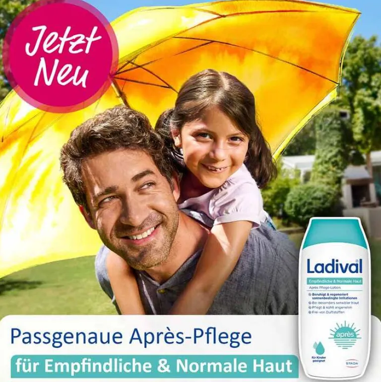 Nach dem Sonnenbaden ist es wichtig, die sonnengestresste Haut optimal zu pflegen und ihre Feuchtigkeitsspeicher aufzufüllen. Um Menschen mit empfindlicher Haut optimal zu versorgen, bietet Ladival die empfindliche und normale Haut-Serie an. Diese wurde speziell für sensible und normale Haut entwickelt und spendet zusätzlich Feuchtigkeit. Sie beruhigt die durch Sonneneinstrahlung beanspruchte Haut und pflegt sie intensiv.