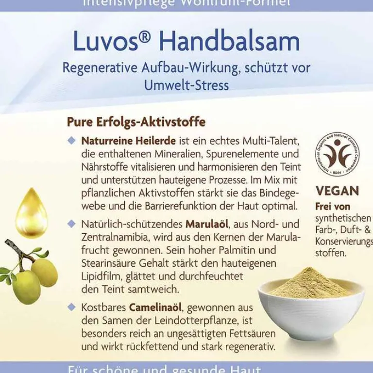 Zertifizierte Naturkosmetik, hergestellt in Deutschland: Das Familienunternehmen Luvos mit 100-jähriger Tradition stellt dieses Produkt nach höchstem Standard von BDIH her. Es ist selbstverständlich vegan, tierversuchsfrei. Die Hautverträglichkeit ist dermatologisch bestätigt. Der Handbalsam ist vollkommen frei von problematischen Zusatzstoffen wie Mikroplastik, Mineralöl, Parabenen, Silikonen, Paraffinen, PEGs, künstlichen Farb-, Duft- und Konservierungsstoffen.