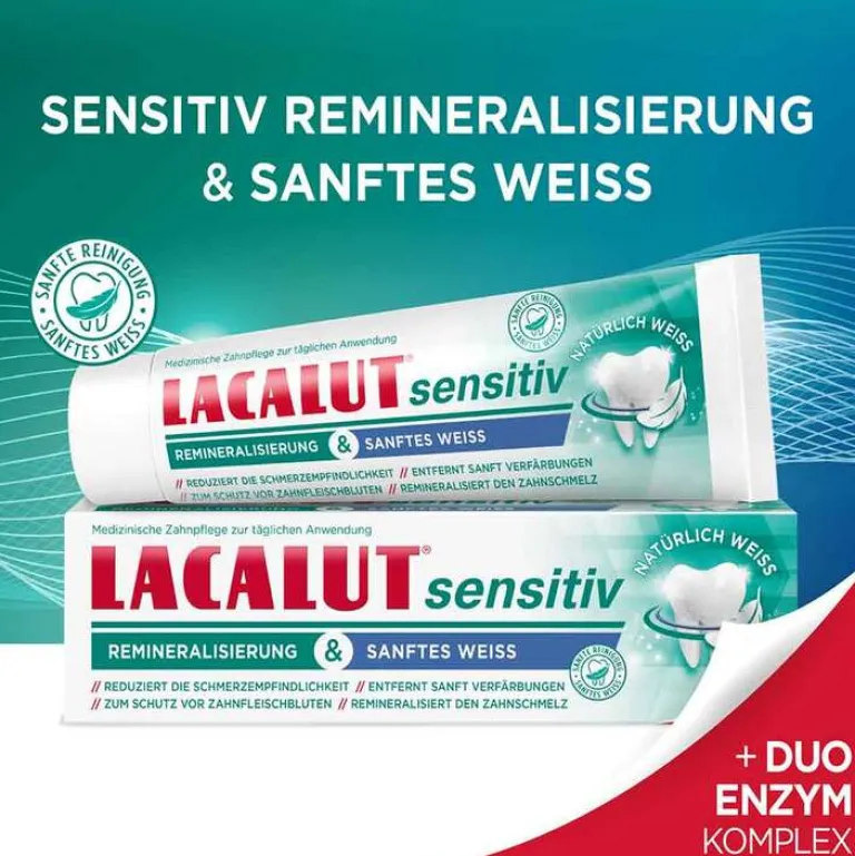 LACALUT, eine der ältesten Zahnpflegemarken Deutschlands, steht für Tradition und Innovation. Mit Forschung und Produktion im saarländischen Homburg bietet die bewährte Marke seit über 90 Jahren hochwertige Mund- und Zahnpflegeprodukte an. LACALUT sensitiv Remineralisierung & sanftes Weiss enthält eine sanfte Formel, die die Schmerzempfindlichkeit der Zahnhälse reduziert und das natürliche Weiß der Zähne erhält. Die Zahnpflege bietet sanften Schutz, reduziert Reizungen und fördert so eine gesunde Mundflora. Der Duo-Enzym-Komplex entfernt sanft Verfärbungen und erhält das natürliche Weiß der Zähne.