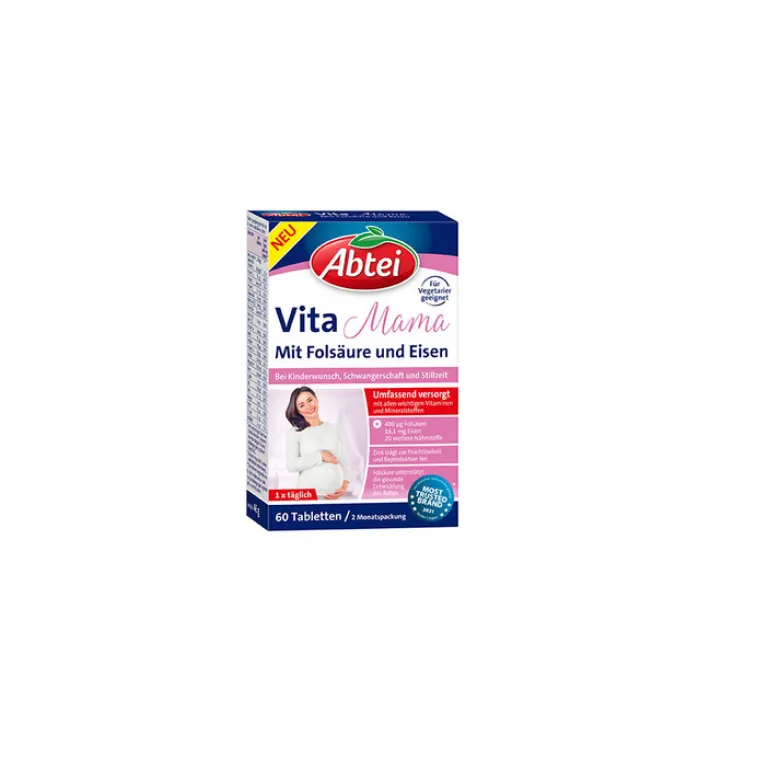 Abtei Vita Mama enthält eine speziell abgestimmte Nährstoffkombination mit Folsäure, Eisen, Jod und 19 weiteren wertvollen Vitaminen und Mineralstoffen die zu einer umfassenden Versorgung in diesen herausfordernden, aber einzigartig schönen Zeiten beitragen.