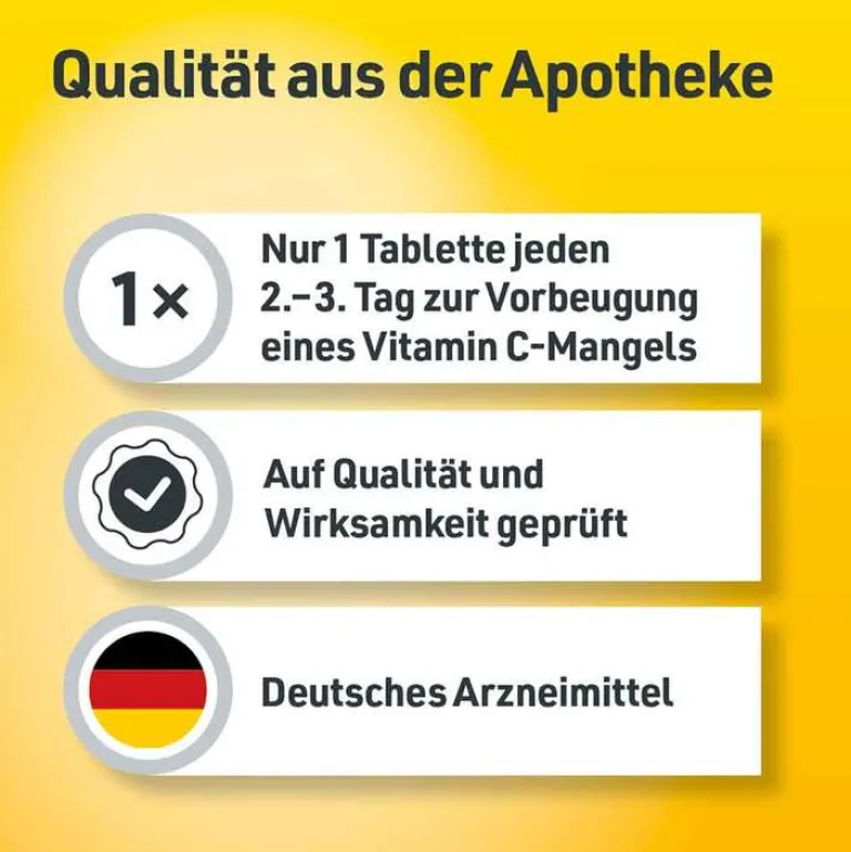 Vitamin C in deutscher Arzneimittelqualität zur Unterstützung des Immunsystems durch Prophylaxe oder Therapie von Vitamin C Mangelzuständen.