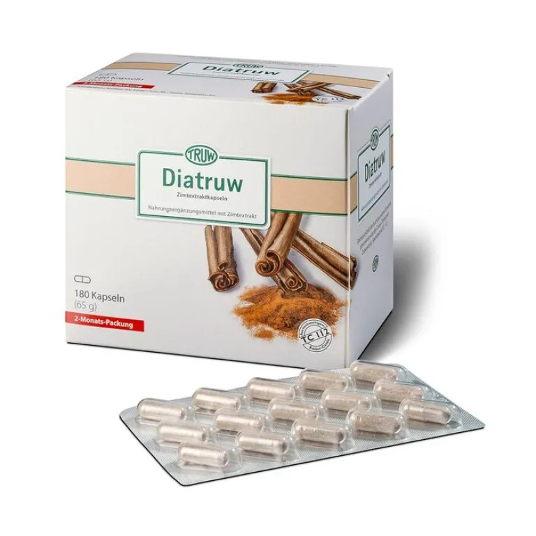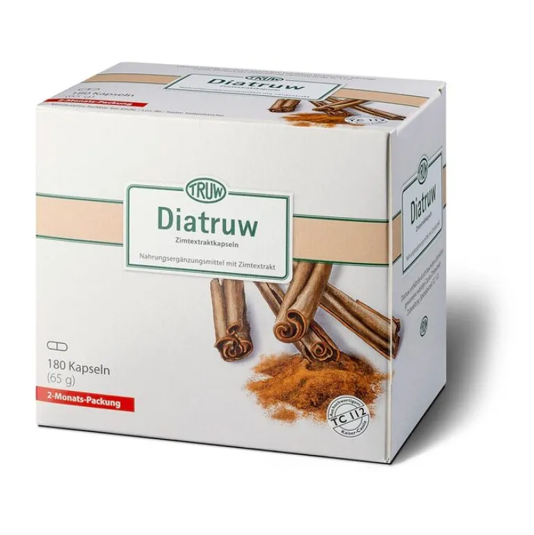 Diatruw Zimtextraktkapseln enthalten die durch besondere Extraktion gewonnene wässrige Cassia-Zimtextrakt-Zubereitung (Spezialextrakt TC 112). 112 mg wässrige Cassia-Zimtextrakt-Zubereitung TC 112 enthält 56 mg Cassia-Zimtextrakt. Das entspricht ca. 1 g Zimtrindenpulver.