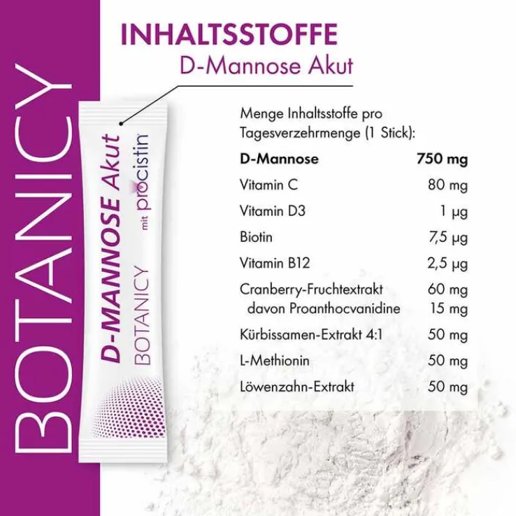 - Trinkpulver zum Auflösen mit D-Mannose (Procistin®), Pflanzenextrakten, Vitaminen und Süßungsmitteln
