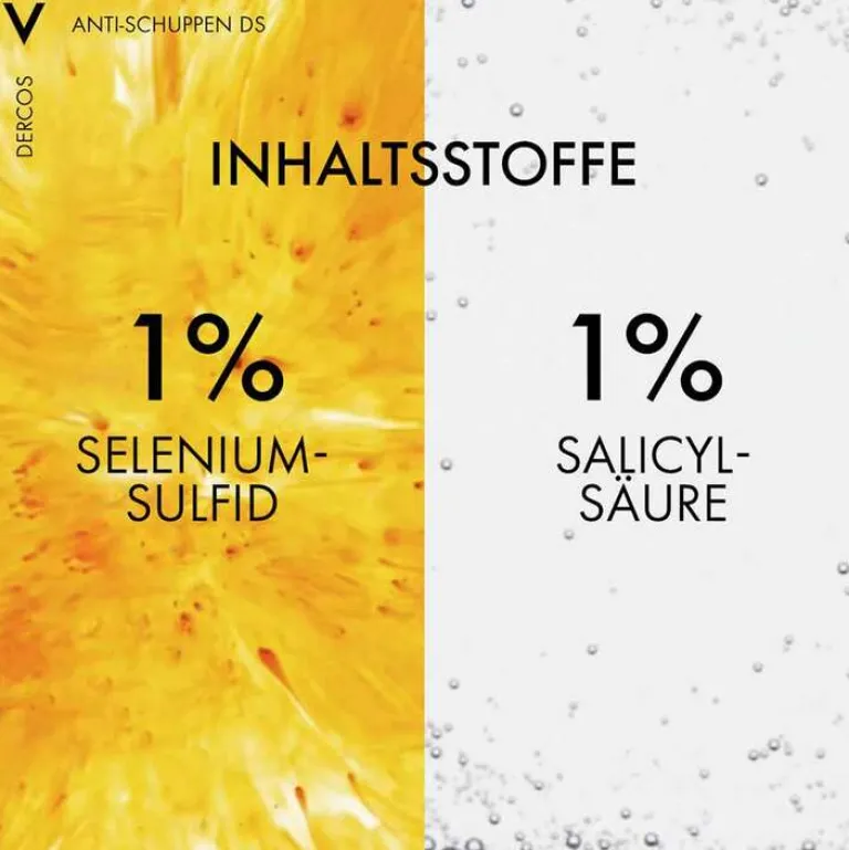 Die effektive Wirkstoffkombination des Vichy Anti-Schuppen Shampoos entfernt Schuppen auf der Kopfhaut langanhaltend. Selendisulfid beugt Schuppenbildung vor und wirkt juckreizmildernd. Salicylsäure entfernt die Schuppen auf der Kopfhaut. Die Inhaltsstoffe Vitamin-E und Cohesyl™ helfen, die Kopfhaut ins Gleichgewicht zu bringen.