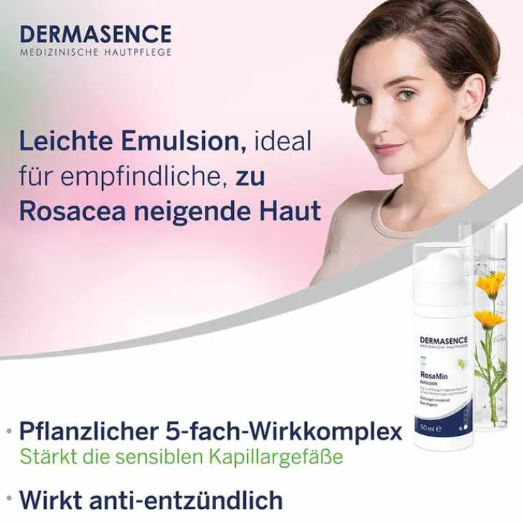 Die Dermasence RosaMin Emulsion ist eine leichte, parfümfreie Emulsion. Sie ist ideal für die empfindliche, zu Rosacea neigende Haut. Die Emulsion stärkt mit pflanzlichem 5-fach-Wirkkomplex die sensiblen Gefäße der Haut und wirkt anti-entzündlich. Das enthaltene Mandelöl sorgt für ein weiches Hautgefühl.