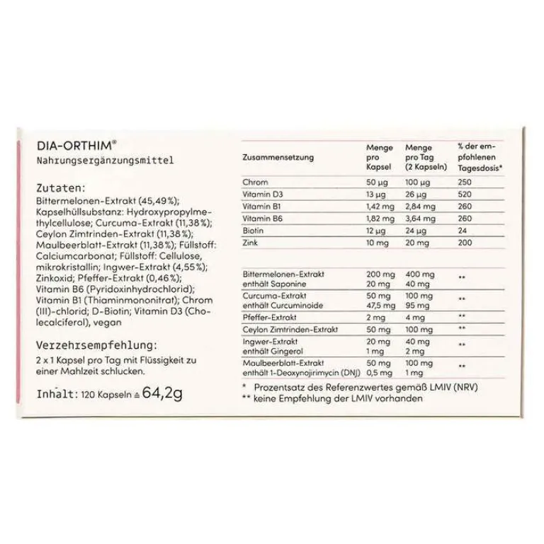 Dia-Orthim besteht aus einer einzigartigen Zusammensetzung und ist frei von Fructose, Gluten und Lactose – einfach und natürlich. Wichtige Inhaltstoffe sind z.B. Bittermelonen-, Curcuma-, Pfeffer-, Ingwer-, Maulbeerblatt- und Ceylon Zimtrinden-Extrakt.